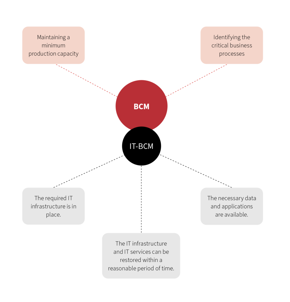 Unforeseen events such as damage to cables caused by construction work, natural disasters such as floods, or direct attacks on the information technology infrastructure affect not only private individuals, but also companies and state institutions. Business continuity management (BCM) involves analysing and managing the risks that such threats pose for the entire organisation. Given the heavy reliance of business operations on information technology, the existence of a fail-safe IT infrastructure is essential for the survival of an organisation. In this sense, IT-BCM provides technical support for business continuity management and ensures that the IT infrastructure and corresponding IT services can withstand a disaster and/or be restored within a reasonable timeframe and in accordance with established priorities. BCM is therefore concerned with maintaining a minimum production capacity in any situation and identifying the critical business processes needed for this purpose. IT-BCM, on the other hand, ensures a certain redundancy of the required IT infrastructure, data and applications. It also enables service to be restored within a reasonable period of time after disruptions.