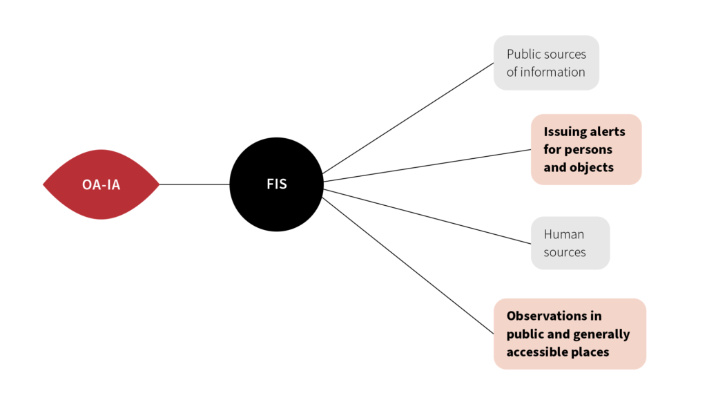 In order to fulfil its tasks, the FIS obtains information from publicly and non-publicly accessible information sources5. In each case, the FIS is required to choose the information-gathering measure that has the least impact on the fundamental rights of the persons concerned. e FIS can take certain measures to gather information independently and without having to obtain specific external authorisation. This is because the intensity of interference with fundamental rights of such measures is relatively low. These measures include gathering information from public sources, carrying out observations in public and generally accessible places, using human sources and issuing alerts regarding individuals and property. The OA-IA mainly focused on observations (e.g. video and audio recordings) in public and generally accessible places (e.g. airports, streets or railway stations) and the use of the computerised police search system (RIPOL), including the national part of the Schengen Information System (N-SIS).