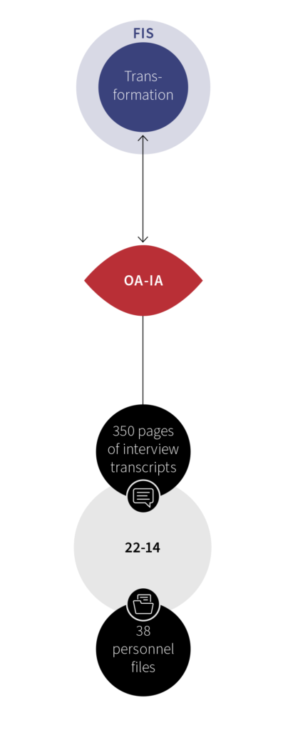 Here, the OA-IA wanted to obtain a representative sample through interviews with staff members. For this purpose, it carried out the logistically challenging task of conducting over thirty interviews. Appropriate consideration was given to the gender, age, language composition, selection of members of FIS working groups and hierarchical levels of the staff interviewed. Several FIS employees spontaneously made themselves available for an interview, others asked if they could make additional statements in connection with previously held interviews. The OA-IA did not disclose all the names of the staff interviewed to FIS management. This ensured that they could answer without bias. In the course of the audit, the OA-IA analysed over 350 pages of interview transcripts and carried out random sampling in 38 personnel files.